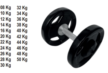 Pegada em alumínio e anilha modelo sport, fabricada em ferro fundido cinzento, revestida de borracha PVC.