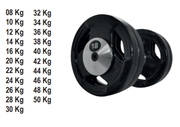 Pegada emborrachada e anilha modelo sport, fabricada em ferro fundido cinzento, revestida de borracha PVC.